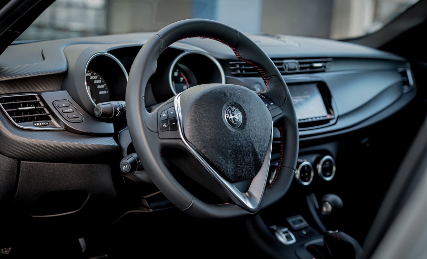 - Alfa Romeo Giulietta 110 Edizione 2021: En el habitáculo tiene un aire deportivo en su diseño, con buena manufactura y correcta calidad en plásticos. Encontramos diferentes terminados para los plásticos y algunas molduras que simulan fibra de carbono, dándole mayor sensación deportiva. El volante tiene el grosor correcto y acompañado de costuras en color rojo que lo hacen muy bien. La parte de los controles se percibe bastante limpia con el número necesario de botones.