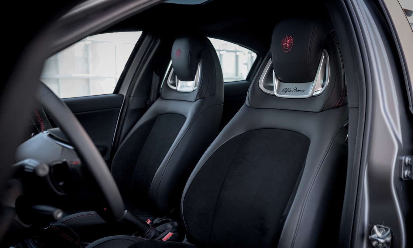 Al tratarse de un auto de características deportivas, los asientos son de tipo cubo y otorgan muy buena sujeción, además de estar tapizados en piel con alcántara, las costuras en color rojo se vuelven a hacer presentes, así como el emblema de Alfa Romeo bordado en las cabeceras y la tipografía de la marca un poco más abajo grabada sobre una superficie en acabado metálico.
