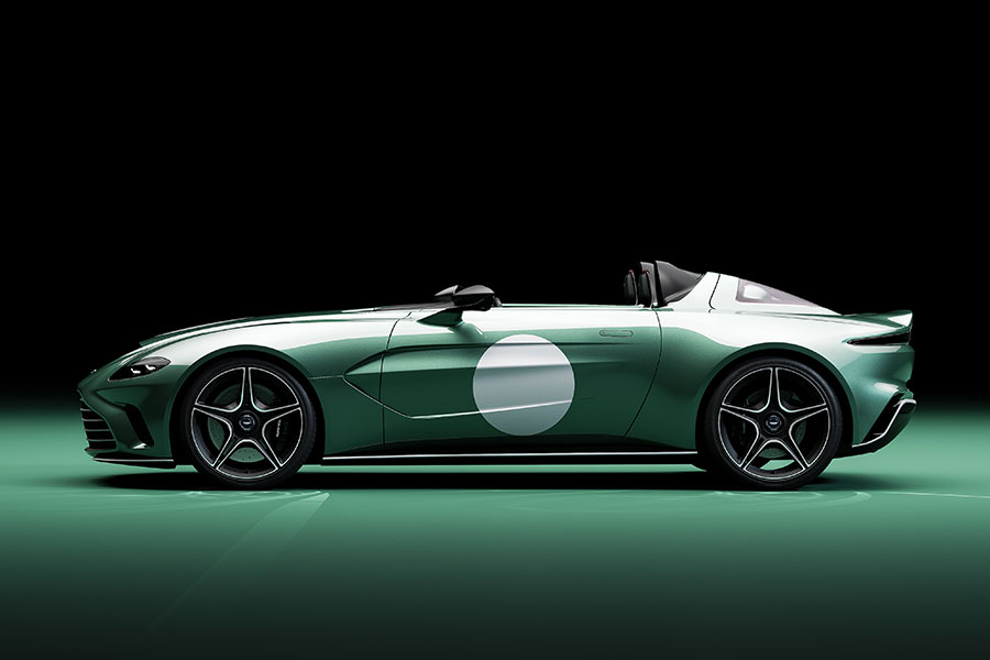 La especificación DBR1 del Speedster V12 incluye una decoración en color verde menta (Aston Martin Racing Green) con gráficos blancos (Clubsport White); una rejilla frontal con acabado brillante (Satin Silver) y rines de 21 pulgadas con bloqueo central, con diseño de radios en estrella y acabados en negro opaco