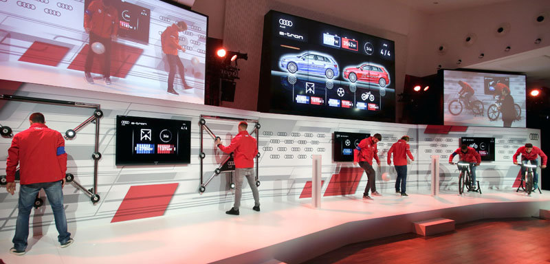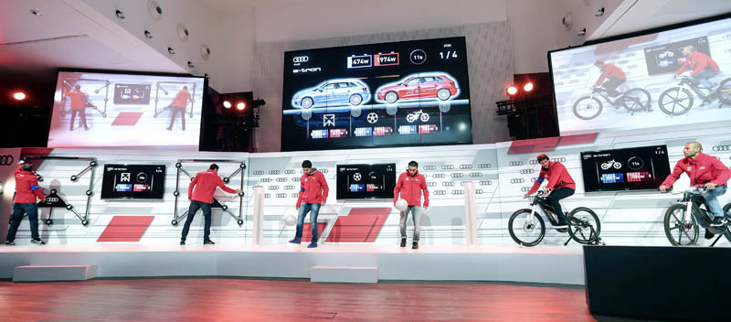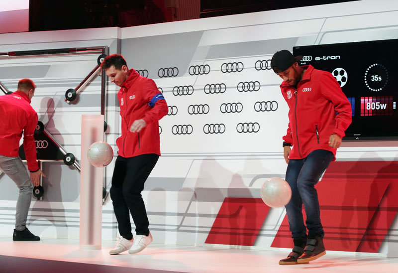 Para ello, los futbolistas blaugrana pedalearon en una e-bike eléctrica, demostraron sus reflejos en el Audi Batak, un panel luminoso interactivo diseñado para mejorar la coordinación y la velocidad de reacción, y dieron toques de balón con la ‘e-tron ball’ para generar vatios.