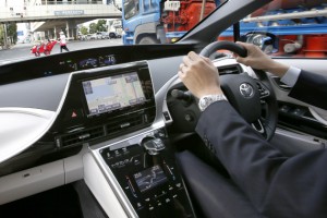 In this photo taken Monday, Nov. 17, 2014, a Toyota Motor Corp. employee drives a Toyota’s new fuel cell vehicle Mirai on the road near its showroom in Tokyo. There will only be a few hundred, and they wonít be cheap, but Toyota is about to take its first small step into the unproven market for emissions-free, hydrogen-powered vehicles. The worldís largest automaker announced Tuesday, Nov. 18 that it will begin selling fuel cell cars in Japan on Dec. 15 and in the U.S. and Europe in mid-2015. The sporty-looking, four-door Toyota Mirai will retail for 6.7 million yen ($57,600) before taxes. (AP Photo/Shizuo Kambayashi)