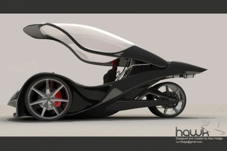 carro eléctrico Hodge Hawk: llevaría unas enormes llantas de 19 pulgadas y tendría una velocidad de 145mph (233kms/h). Tanto delante como detrás llevaría frenos de disco, lo que le permitiría tener una capacidad de frenada envidiable por una moto.