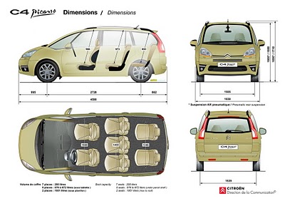 Citroen C4 Grand Picasso 2010: mide 4590mm de largo, 1710mm de alto, 1830mm de ancho sin espejos y tiene una distancia entre ejes de 2728mm