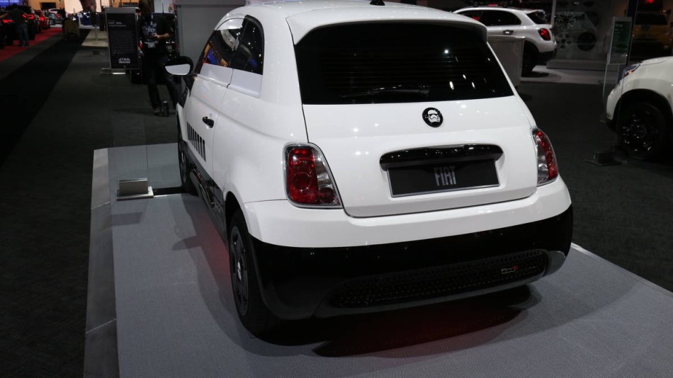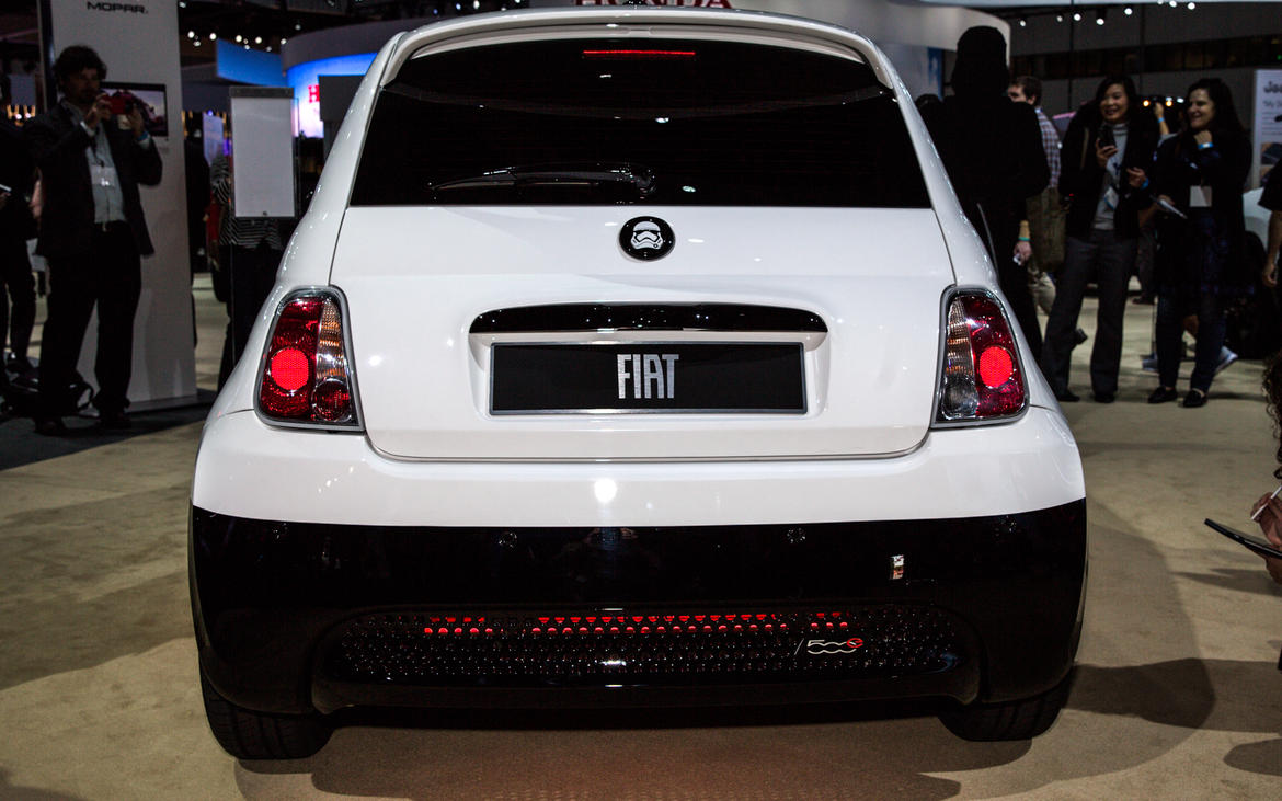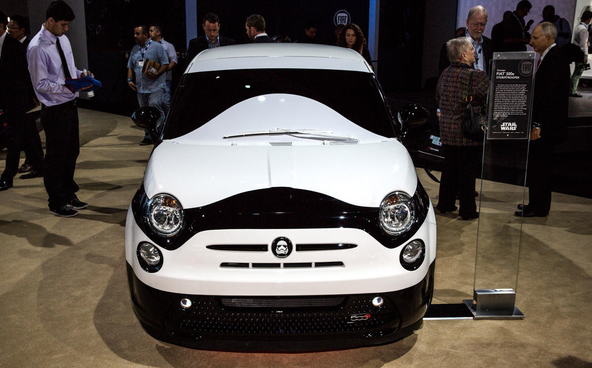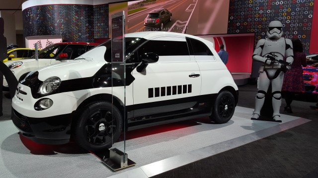 - FIAT 500e Stormtrooper: Para el próximo 18 de diciembre está confirmado el regreso de la saga cinematográfica de la Guerra de las Galaxias, y como parte de la colaboración de FCA en la nueva película, Star Wars: The Force Awakens, la marca italiana Fiat le muestra al mundo en el Autoshow de Los Ángeles 2015 la edición especial del FIAT 500e Stormtrooper, un auto diseñado por el preparador Garage Italia Customs, y que está inspirado en la armadura de las tropas de asalto del Imperio Galáctico