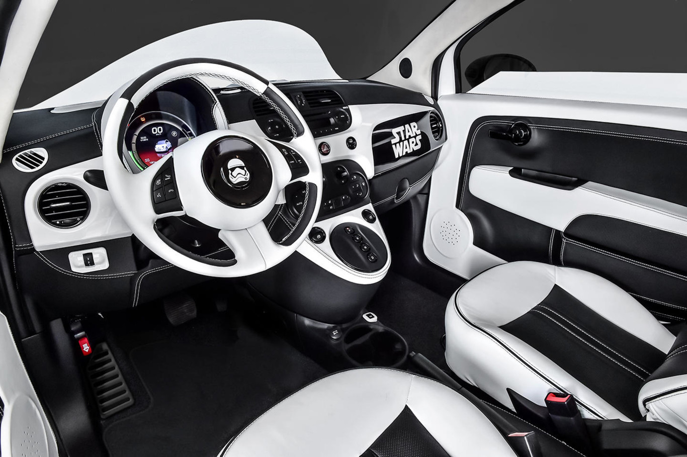 - FIAT 500e Stormtrooper: Interiormente no desentona y muestra un matiz en blanco y negro, los asientos están tapizados en cuero y Alcántara. El logo de Star Wars resalta en el tablero de instrumentos blanco. Todos los detalles están pintados en blanco y negro, destacando la insignia de la Primera Orden que decora el volante forrado en piel de dos tonos.
