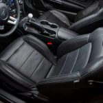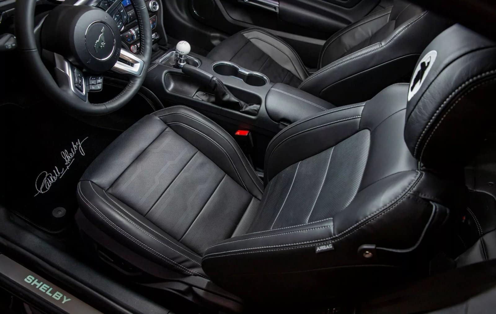 Antes de entrar en el habitáculo, nos reciben unos umbrales de las puertas con la firma de Shelby. Ya en el interior, descubrimos unos asientos de cuero negro con costuras blancas en contraste y el logotipo de Centennial Edition en los reposacabezas. Junto a ellos no faltan una placa numerada en el salpicadero y alfombrillas que lucen la firma de Carroll Shelby.