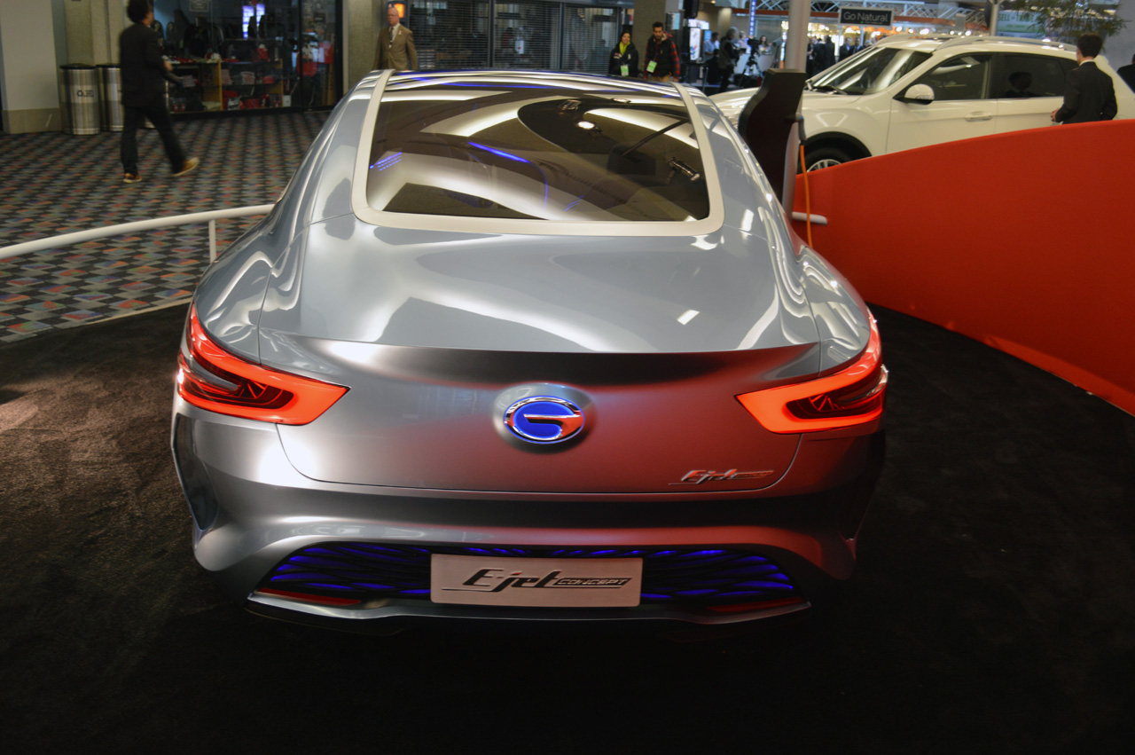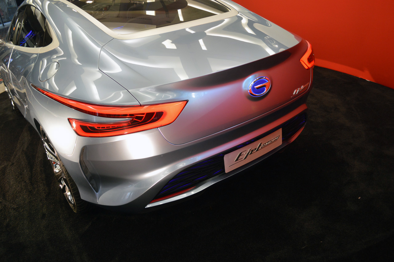 El GAC E-Jet Concept es un sedán muy atractivo que mide 4570 x 1790 x 1490 mm para la carrocería, que destaca por su frontal y la peculiar distribución de las ópticas traseras, que se extienden casi hasta las puertas de los pasajeros.