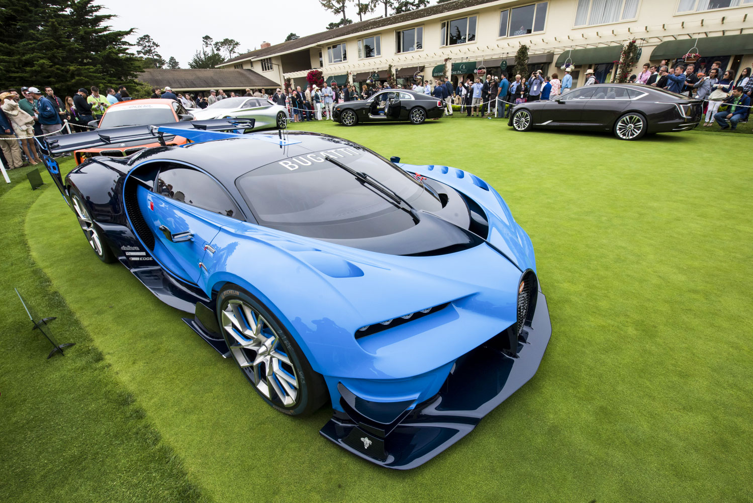 - A Bugatti Vision Gran Turismo concept car is displayed during the 2016 Pebble Beach Concours d’Elegance in Pebble Beach, California, U.S., on Sunday, Aug. 21, 2016. The center of the car universe this week is Pebble Beach Concours d’Elegance, where collectors will be clinking champagne and dropping around $370 million dollars at the vintage auto auctions. Photographer: David Paul Morris/Bloomberg
