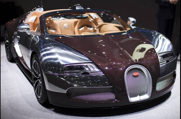 A Bugatti Veyron Grand Sport car is displayed on the car maker’s booth during the first media day of the Geneva Auto Show at the Palexpo in Geneva