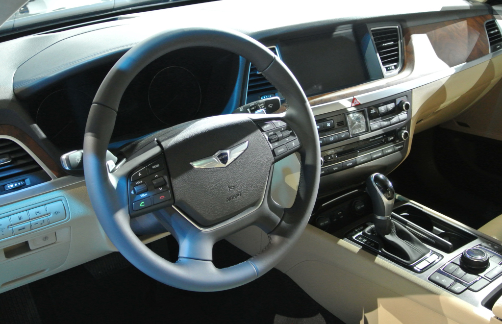 El interior del nuevo Hyundai Genesis Sedán 2015 fue diseñado para beneficiar a sus 5 ocupantes con un ambiente espacioso y cómodo. Según Hyundai, la simplificación de la palanca de cambios y el panel de instrumentos garantiza una disposición intuitiva y una sensación de amplitud. Así también, será el primer modelo en ofrecer la segunda generación del sistema de información y entretenimiento Blue Link.