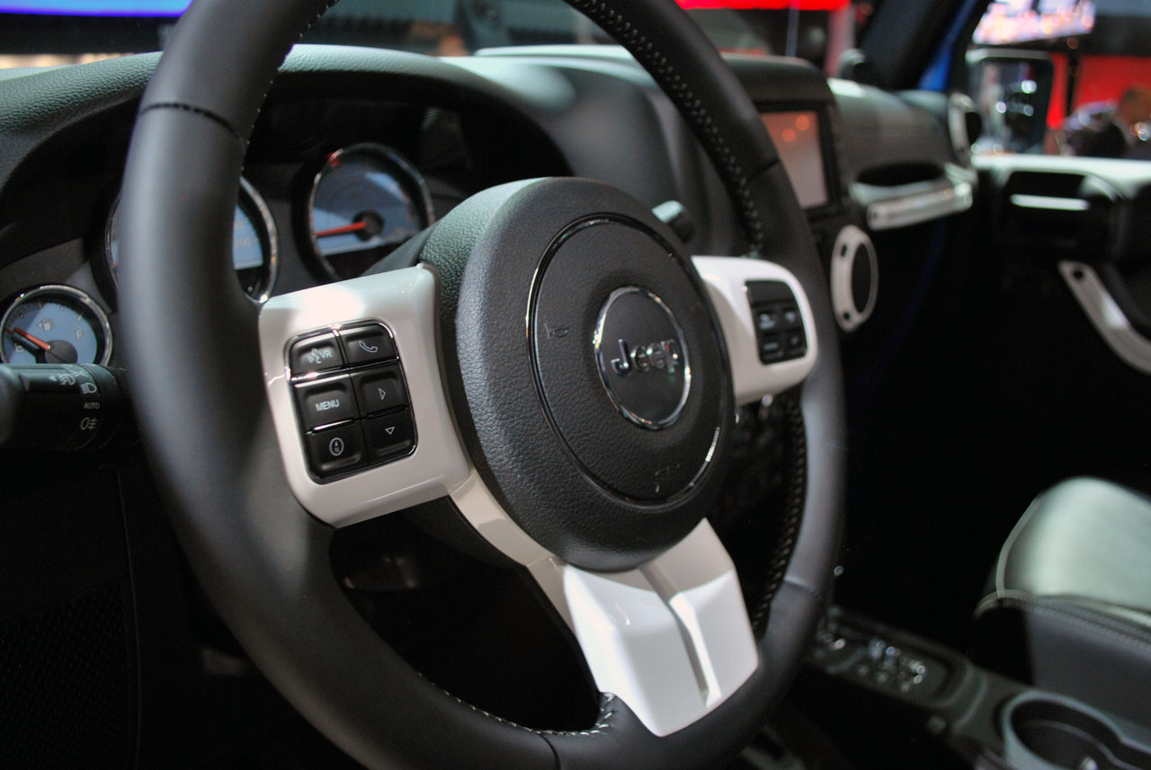 El equipamiento de serie del Jeep Wrangler Polar Edition 2014 incluye también un tapizado en cuero negro volante con costuras de color blanco perla y de alto brillo de cerámica, así como, marcos pintados de blanco .