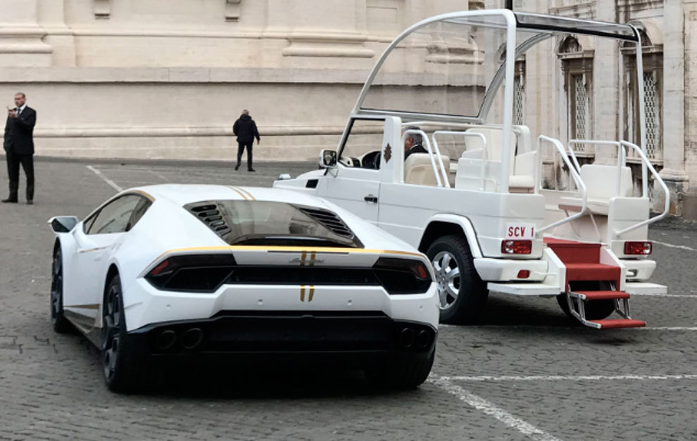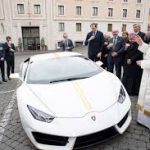 - El Lamborghini Huracán RWD del Papa Francisco: El Papa Francisco recibió ayer miércoles un Lamborghini blanco y amarillo, pero no lo usará en los caminos arbolados de los jardines del Vaticano. El lujoso deportivo fue entregado por Stefano Domenicali, CEO de Lamborghini. El vehículo normalmente se vende por un precio de más de 200.000 dólares pero con la firma del Papa su precio aumentará notablemente.