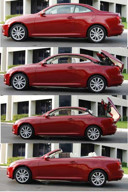 El Lexus IS 350 Convertible cuenta con un techo dividido en tres paneles que permiten su apertura, solamente tocando un botón, en 21 segundos, el Lexus IS 350 ofrece la sofisticación de un convertible con el estilo deportivo de un coupé. Este carro tiene un precio para el mercado de EEUU de $43.940 dólares.