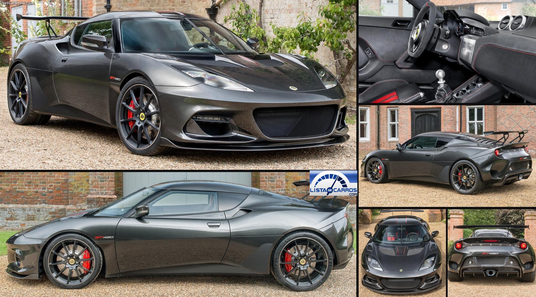 - Lotus Evora GT430: Logra una aceleración de 0 a 100 en tan solo 3.7 segundos, y lograr una velocidad punta de 305 km/h. Esto se debe gracias al menor peso del modelo ya que ahora solo pesa 1,258 kilos, es decir 26 menos que el ya muy ligero Evora Sport 410. Esto se logró vía un uso extenso de fibra de carbono en la carrocería del auto, lo cual se aprovechó para darle atributos aerodinámicos únicos para el GT430, pues ambas defensas son de carbono y están diseñadas con el flujo de aire y apoyo aerodinámico en mente. Otras piezas hechas de carbono son el splitter frontal, el enorme alerón trasero fijo y el toldo. Los apéndices aerodinámicos son capaces de generar hasta 250 kilos de downforce a más de 250 km/h.