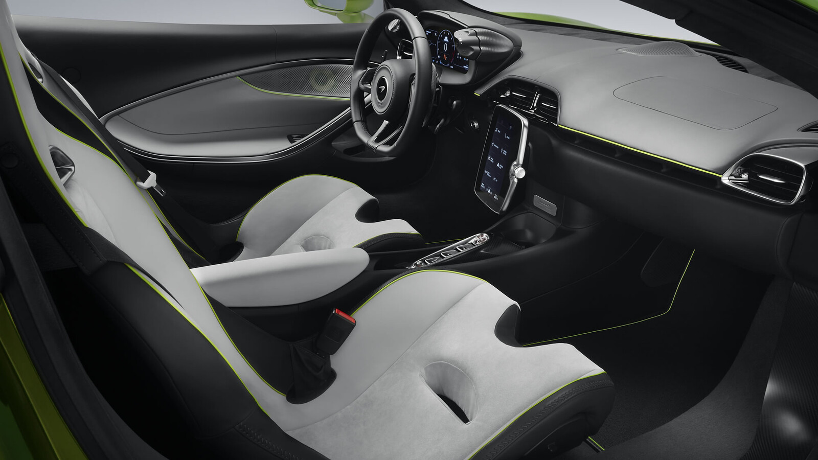 - McLaren Artura: En el interior, el Artura presenta novedades interesantes, si bien es inmediatamente reconocible como un McLaren, la resolución es extremadamente minimalista. El volante no tiene botón alguno, esto se debe a que los mandos relacionados con los modos de conducción y controles del tren motriz que se manejan por separado fueron movidos a un costado del clúster de instrumentos digital. Cabe señalar que volante y clúster se mueven de manera conjunta al momento de ajustar la posición de manejo. Un display táctil en formato vertical, desde donde se controlan aspectos como navegación, teléfono, climatizador automático bizona, audio que por cierto de manera opcional se trata de un sistema firmado por Bowers & Wilkins con 12 bocinas, entre otros completa la interfaz de interacción con el vehículo.