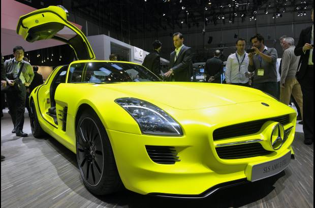 The new Mercedes SLS AMG E-Cell is shown during the press day at the 81st Geneva International Motor Show in Geneva, Switzerland, Tuesday, March 1, 2011. The Motor Show will open its gates to the public from March 3 to 13. (AP Photo/Keystone, Sandro Campardo) Switzerland Auto Show