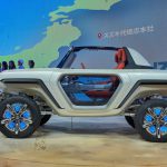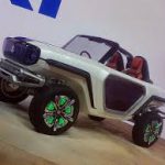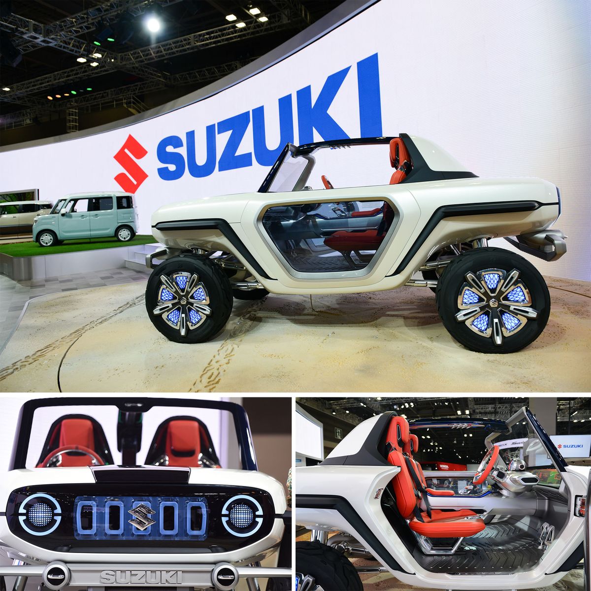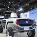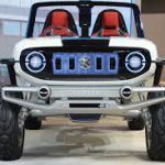- Suzuki e-Survivor Concept: Una de las claves del diseño de este Concept son sus formas. Alejado del 4×4 más tradicional, este prototipo adquiere características propias de un buggy con un morro elevado con notables protecciones, una parrilla frontal bastante robusta e iluminada y unos grupos LED redondos. Este morro sobreelevado es consecuencia directa de sus grandes neumáticos y de la posición del sistema de suspensiones de gran recorrido. Fruto de su configuración de biplaza sin techo, no pasa desapercibida tampoco su zaga, con el mismo patrón de diseño que el frontal.