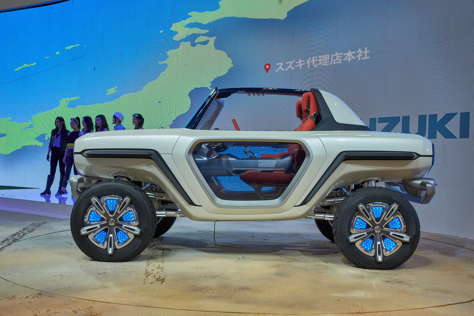 - Suzuki e-Survivor Concept: Uno de sus puntos más llamativos son sus puertas traslúcidas y los llamativos rines con iluminación que cambia de tono.